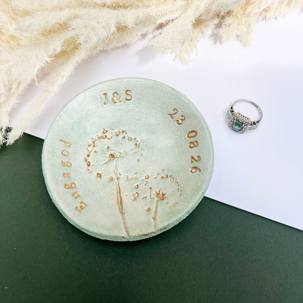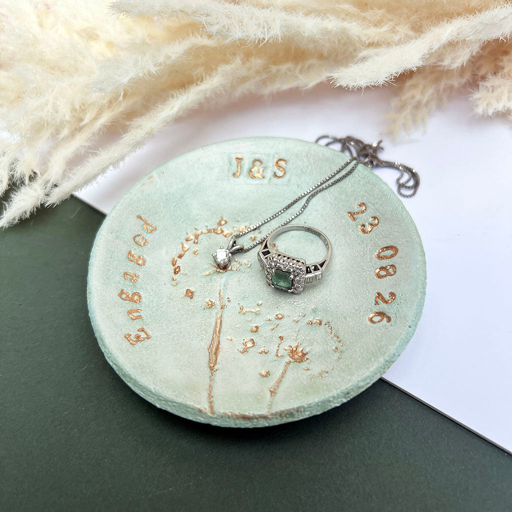 A lovely personalised ceramic ring dish, with the engaged couple's initials and engagement date.